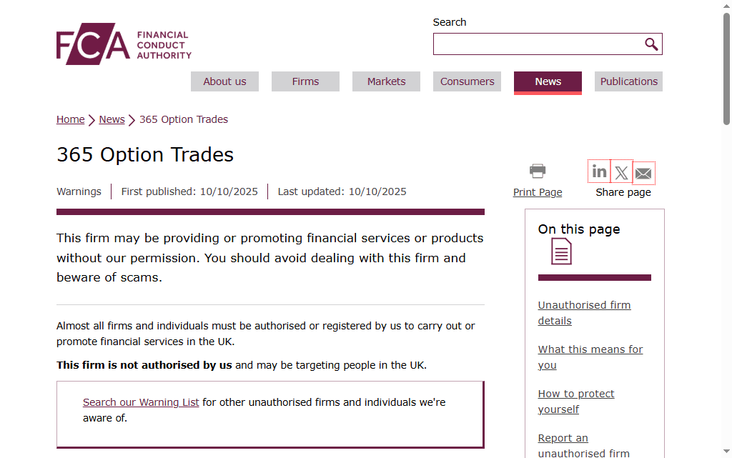 The Financial Conduct Authority (FCA) has warned about 365 Option Trades for conducting business without authorization. The platform has no license from any reputable authority like the FCA, ASIC, or CySEC, which raises a question about its legitimacy.