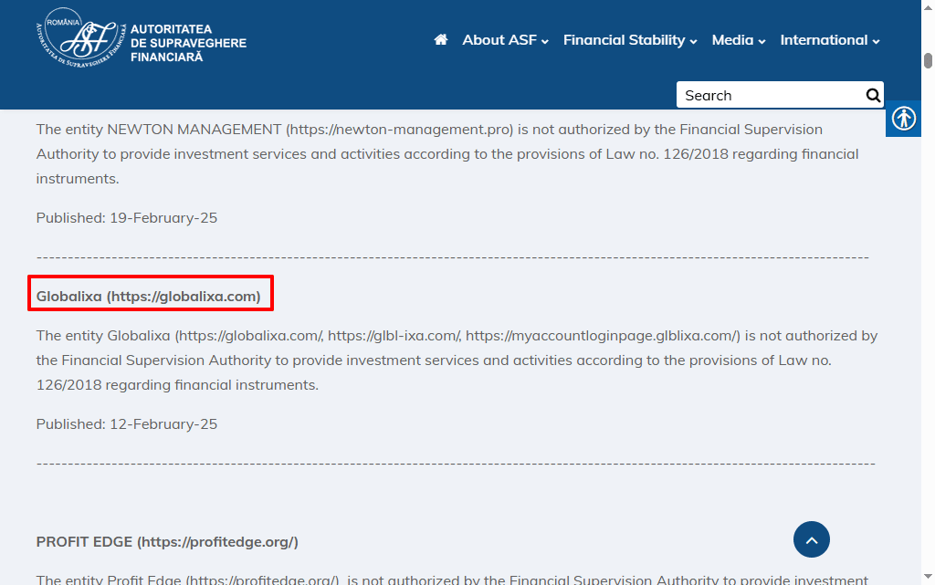 The Romanian Financial Supervisory Authority (ASF) has issued a formal warning against Globalixa, stating that the firm was illegally providing investment services.