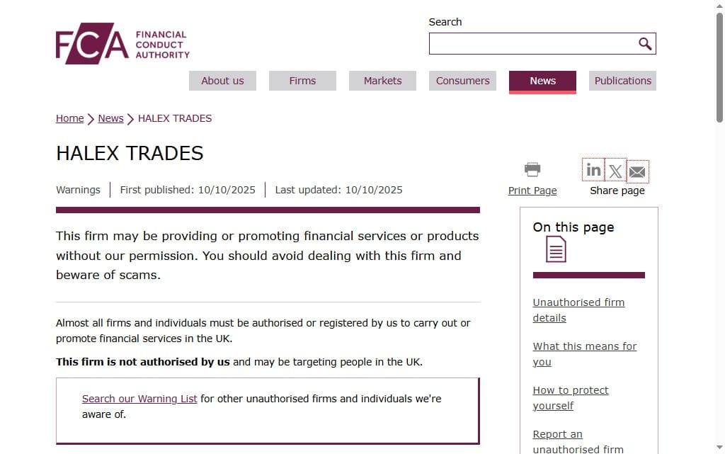 On January 10, 2024, the Financial Conduct Authority (FCA) in the UK issued a public warning about HALEX TRADES for illegal provision of financial services. The FCA noted that clients of unregulated companies are not entitled to any compensation schemes nor able to access any ombudsman services.