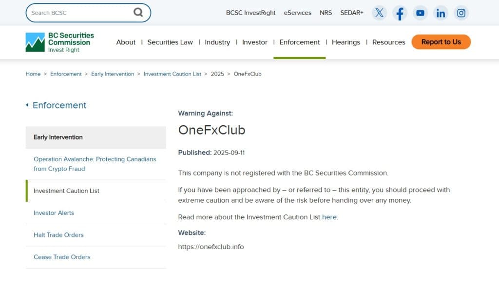 On September 11, 2025, the British Columbia Securities Commission (BCSC) issued an official warning against OneFxClub, confirming that it is not registered to trade or advise on securities or derivatives in British Columbia. This is a significant red flag for anyone considering using the platform, as operating without proper registration is illegal and highly risky.